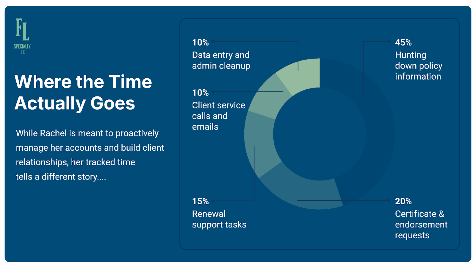 15% – Renewal support tasks: Building comparisons, analyzing loss runs, gathering information—usually in last-minute panic mode.